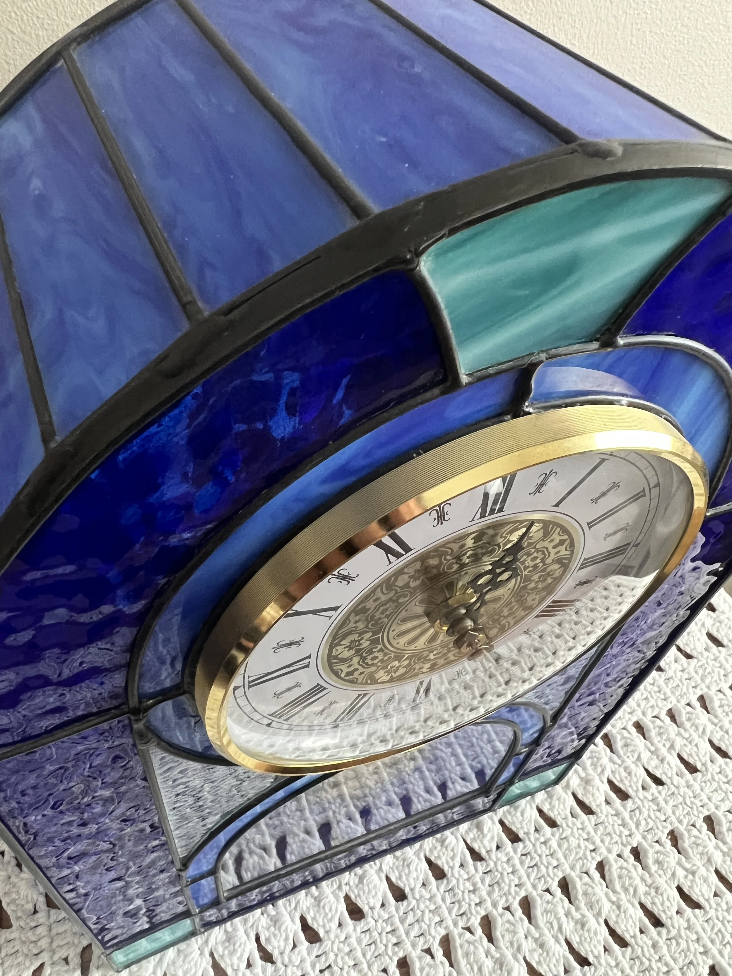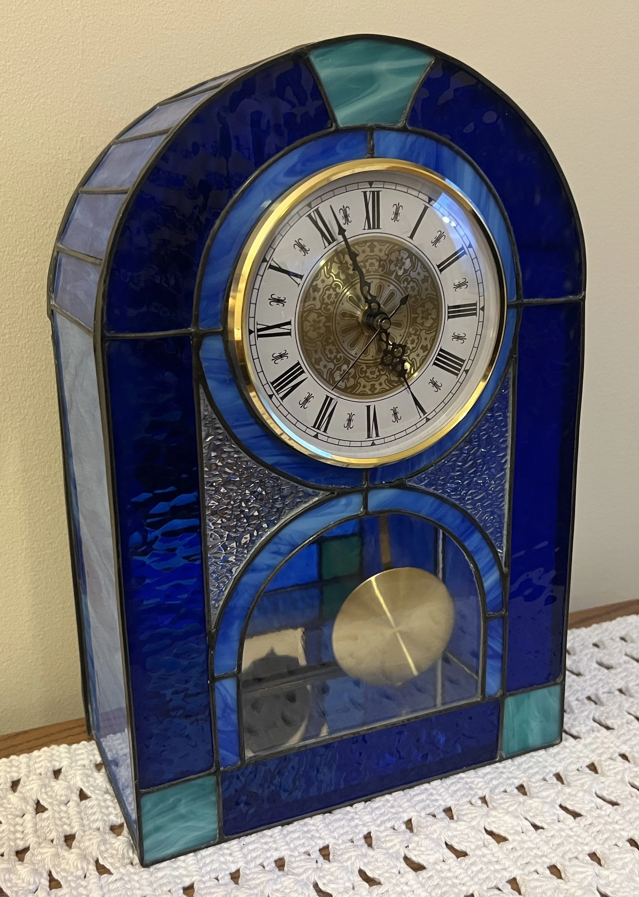 Glass Mantel ClockA hand-crafted glass mantel clock, featuring rich cobalt blue and teal hues and a window view of the pendulum in front of a mirrored back. Slide 1 Slide 1 (current slide) Slide 2 Slide 2 (current slide) Slide 3 Slide 3 (current slide)